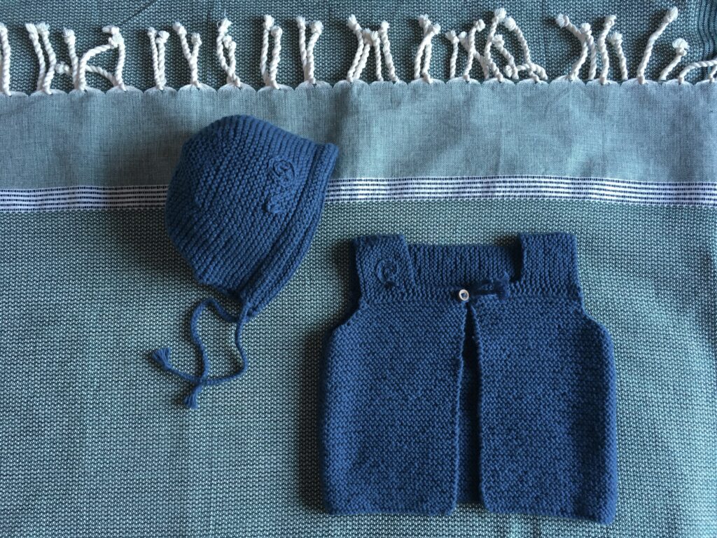 6/9mois (blanc, gris, canard) — 25€ l’ensemble. Un bandeau peut remplacer le bonnet.
