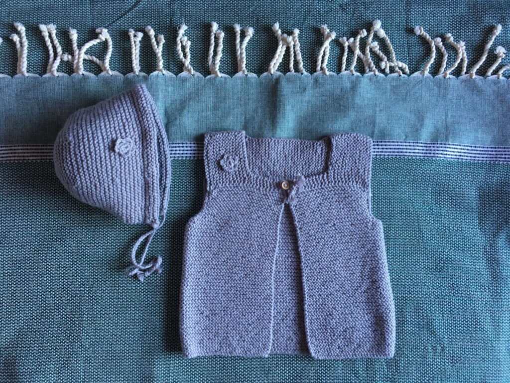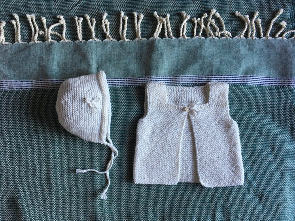 Les petits gilets accompagnés de leur béguin se portent dès la naissance. Ils sont tricotés avec un fil d’exception composé de coton et de cachemire de la maison Cheval Blanc.